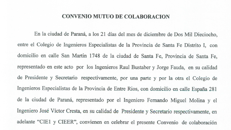 En representación del CIE Distrito 1, el presidente y el secretario, Ing. Raúl Bustaber y AUS Jorge Fauda respectivamente, firmaron un convenio de colaboración con sus pares del Colegio de Ingenieros Especialistas de Entre Ríos (CIEER).